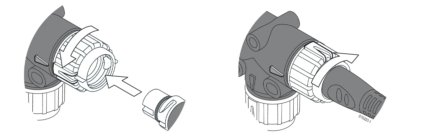 | 1. | カラーをロック解除位置に回転させます(成型された矢印が揃うようにします)。 |